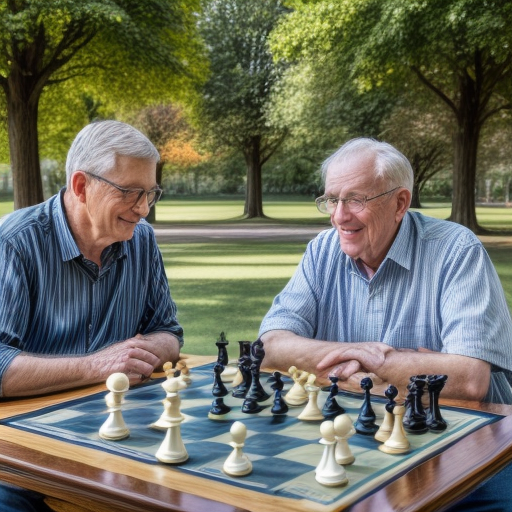 Two men are playing chess at a table in the park when suddenly, a majestic hawk swoops down from the sky and lands on the chessboard, interrupting their intense game. The two gentlemen are taken aback by the unexpected visitor, but they can’t help but admire the bird’s beauty and grace. They watch in awe as the hawk spreads its wings and takes off into the horizon, leaving them with a newfound sense of wonder and appreciation for the natural world around them.